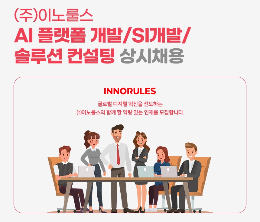 설명: 이노룰스가 AI 플랫폼 개발, SI 개발, 솔루션 컨설팅 부문 상시 채용을 진행한다.
