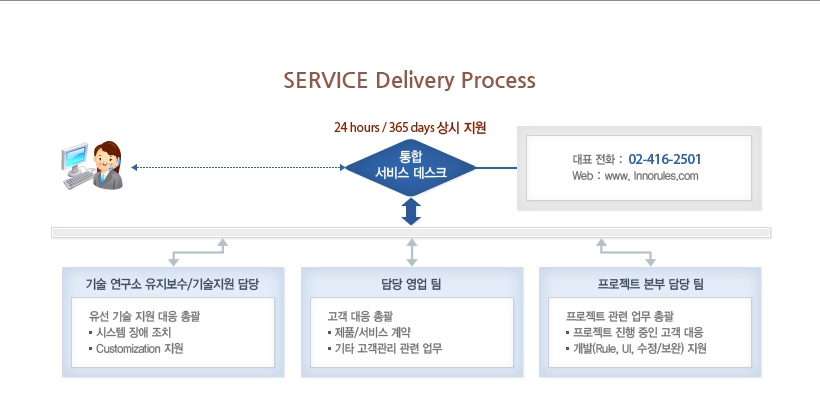 이노룰스는 고객의 안정적인 시스템 운영 및 보다 향상된 서비스 수준의 유지를 위하여 버그 패치, 기술 지원, 업그레이드 등의 고객 서비스를 유상으로